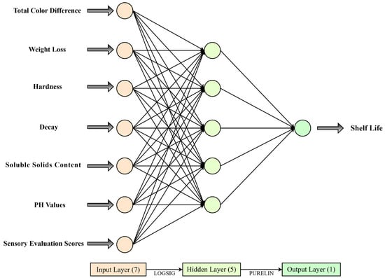 This paper is based on the BPNN model to construct predictive models for food shelf life. BPNN is a feed-forward supervised learning model with multiple layers of fully connected neurons, including input, hidden, and output layers. Each neuron receives weighted and summed inputs from the previous layer and outputs them to the next layer through a non-linear activation function. The model calculates the error function between the output layer and the target value and adjusts the weights by backpropagating the error signal using the chain rule. The model iterates until the error function is minimized, allowing the network to approximate the desired output. BPNN can capture the non-linear relationships between individual indicators and is widely used in food shelf-life prediction research [15].