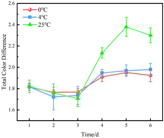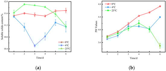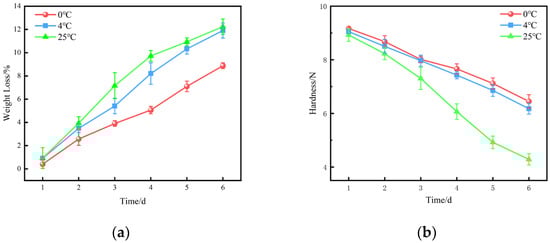 The blueberries were divided into three groups, A, B, and C, corresponding to three different storage temperatures: refrigerated (0 °C), refrigerated (4 °C), and room temperature (25 °C), with 1400 g each. Then each group A, B, and C was further divided into seven groups of 200 g each according to their weight (each blueberry weighed ranging from 2.0 to 2.5 g), and 90 blueberries were selected as the experimental samples for each day according to this standard and then placed in a 15 × 10 × 5 cm fresh-keeping box and sealed with PE fresh-keeping film (thickness of 0.02 mm), numbered from 0 to 6. The samples were stored in constant temperature boxes at 0 °C, 4 °C, and 25 °C with an interval of 30 min (to leave time for measuring physicochemical indicators), and the relative humidity was controlled at 90–95%. After sorting the samples, the quality and color parameters of the blueberries at the initial stage of storage (T0) were measured immediately to determine the initial values of the blueberries at zero storage time. The samples were stored for 6 days in total. The sensory evaluation, the TPA tests, and the physicochemical indicator measurement experiments were performed once a day in sequence.