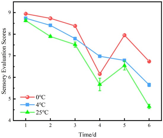 - This paper compares the shelf life at three storage temperatures with a sensory evaluation score of six as the end point of shelf life. The results are shown in Figure 11. It can be seen from Figure 11 that the shelf lives of this variety of blueberries at 0 °C, 4 °C, and 25 °C are 5.99 days, 5.35 days, and 3.67 days, respectively.