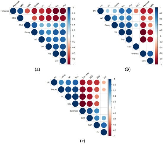 The impact of different input indicators on the model’s prediction accuracy may vary. Figure 12 shows the correlation analysis results of different indicators and shelf-life at 0, 4, and 25 °C. Weight loss and firmness had the highest correlations with shelf life at these temperatures, respectively. Thus, these two indicators could predict the shelf life of blueberries more accurately than others. This agreed with Huang et al., who built blueberry freshness prediction models based on gas information and machine learning algorithms (BP, RBF, SVM, and ELM) at different temperatures and reported that SVM achieved the highest prediction accuracy of 94.01% [8]. However, the proposed model in this paper had a higher prediction accuracy of 96.73%, which might be attributed to the genotype differences that affected the quality change patterns and shelf-life of blueberries and consequently the model’s performance.