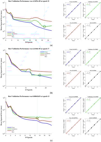 Network performance plots and regression analysis of the MRMR-IDBO-BPNN model for predicting the shelf life of blueberries at different storage temperatures: (a) 0 °C; (b) 4 °C; and (c) 25 °C.