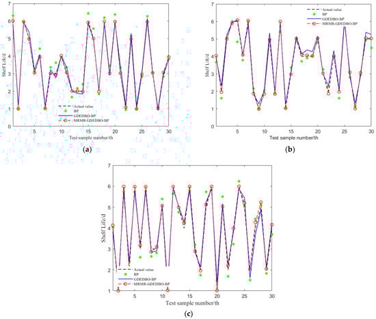Figure 14a–c show the predicted values of the three neural network models BP, GDEDBO-BP, and MRMR-GDEDBO-BP for the shelf life of blueberries at three storage temperatures of 0, 4, and 25 °C compared with the actual values, respectively (the prediction results are shown in Table 10. As shown in Figure 14, compared with the original BP neural network, the predicted values of the BP neural network model after MRMR feature selection and GDEDBO optimization were closer to the actual values and almost completely coincided with the actual value curve, proving the superiority of the MRMR-GDEDBO-BPNN model proposed in this paper in predicting blueberry shelf life.