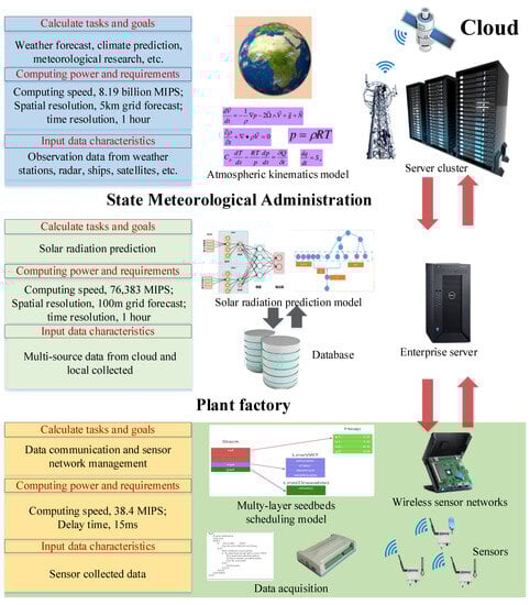 It is practically difficult to forecast the hourly sunshine shedding through a greenhouse roof window because only city-scale data are available from public weather satellites. Therefore, the end-edge-cloud architecture proposed for seedbed scheduling is shown in Figure 1. Plant factories can execute seedbed scheduling tasks according to the calculated sunshine from weather forecast services.