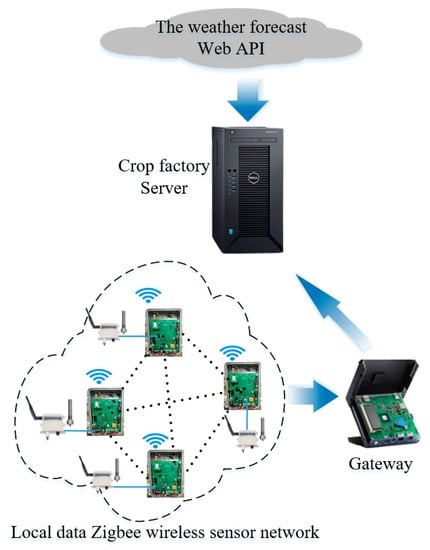 We collected historical statistical meteorological data from 1990 to 2010 in the Shanghai region of China in the Meteonorm Global Climate Database. It includes 21 meteorological elements such as illumination time, cloud coverage, wind speed, total horizontal radiation, relative humidity, and air pressure. These data were recorded at hourly intervals. At the same time, we obtained hourly weather forecast data for 14 meteorological factors from 20 July 2018 to May 2019 in the plant factory location, Minhang District, Shanghai, via the internet interface. The rest of the data were taken as testing data during this period. We built a wireless sensor network for local data acquisition recording temperature, humidity, and solar radiation every 3 min. Real-time environment data was transmitted to the server through ZigBee wireless sensing technology. The data acquisition platform is shown in Figure 2. We averaged this part of the data in hours to correspond to the timestamps of other meteorological data and added the time feature, month and hour, to the data set. Missing data in datasets were represented by NaN. Solar radiation was labeled as the target, and other meteorological elements were labeled as the . We used Python to build and train the model.