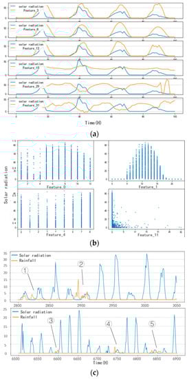 - Temporal components . Meteorological data are often recorded as time series and meteorological characteristics tend to be time-delayed. Figure 3c shows that sunshine always decreases to different degrees before and after rain, and then returns to a strong level some time after rain, as indicated by the mark. The position of the numbers marked in the Figure 3c indicates rainfall here. The temporal correlation between them is