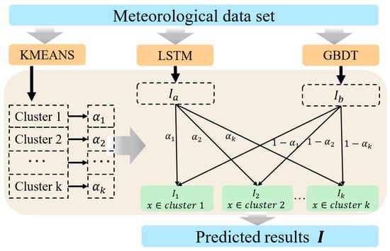 Input the normalized data set into the K-means model, and K center points are the output, corresponding to K data clusters. Each sample belongs to one of the data clusters, and the prediction results in the LSTM and GBDT models can also be expressed as and . Finally, calculate the weighted prediction results as follows:
