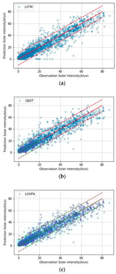 The comparison of predicted and observed values for LSTM, GBDT and LGHPA: (a) LSTM; (b) GBDT; (c) LGHPA.