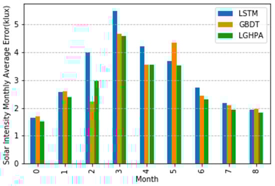 The monthly sunshine average error of LSTM, GBDT and LGHPA.