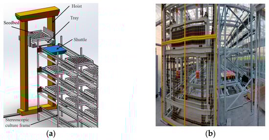 The schematic drawing and photograph of seedbed movement routing: (a) engineering drawing; (b) photograph of multilayer seedbeds.