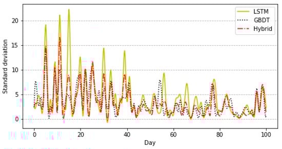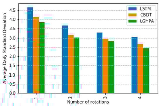 The average daily standard deviation of LSTM, GBDT, and LGHPA for the number of rotations.
