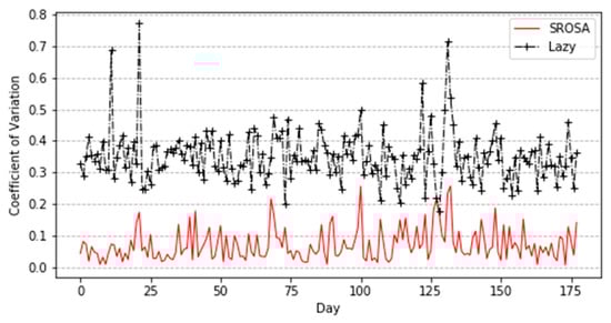 Figure 13 shows the 175-day coefficient of variation of the quantity of light received by the seedbeds for the lazy method and the SROSA, the dispersion of the amount of light received by the seedbed is much smaller than that of the lazy method. We calculated the average coefficient of variation for all predicted days. The average coefficient of variation by the SROSA method was reduced by about five times compared to the lazy method, which were 7.1% and 35.1%.