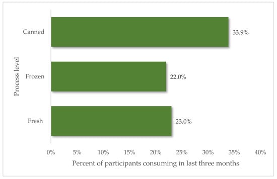 Survey participants were asked about their spicy pepper consumption, exploring different pepper varieties as well as different processing levels, e.g., fresh, dried, or frozen. Figure 3 summarizes the participants' long-green chile consumption. Approximately one-third of the participants indicated they had consumed canned long-green chile within the last three months. The consumption of frozen and fresh long-green chile in the last three months was reported by approximately one out of five participants.