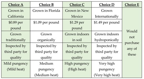 Table 3 shows the attributes and attribute levels included in the experiment. Figure 4 illustrates how the choices were presented to participants. As noted above, a majority of the choice experiment attributes were influenced by previous research, with the exception of production types. Options of production types included traditional, organic, indoor soil, and indoor hydroponic. While several of these options are not commonly used in commercial long-green chile production, e.g., indoor production, they were included to explore consumer acceptance of chile grown with alternative, water-saving production techniques.