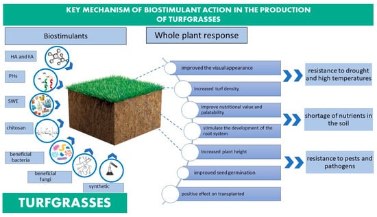 In Regulation (EU) 2019/1009 of the European Parliament and of the Council of 5 June 2019, a biostimulant is defined as “a product stimulating plant nutrition processes independently of the product’s nutrient content with of product the sole aim of improving one or more of the following characteristics of the plant or the plant rhizosphere: (a) nutrient use efficiency; (b) tolerance to abiotic stress; (c) quality traits; (d) availability of confined nutrients in soil or rhizosphere”. Biostimulants are compounds that promote plant growth and development, enhance resistance to stress, improve yields and enhance the quality of agricultural products. The effectiveness of biostimulants relies on their composition. Biostimulants comprise various organic and inorganic compounds that directly impact plant metabolism. Biostimulants are eco-friendly additives, and they find widespread use in sustainable agriculture. Nevertheless, the outcomes of biostimulants on grasses have not been adequately researched to this day.
