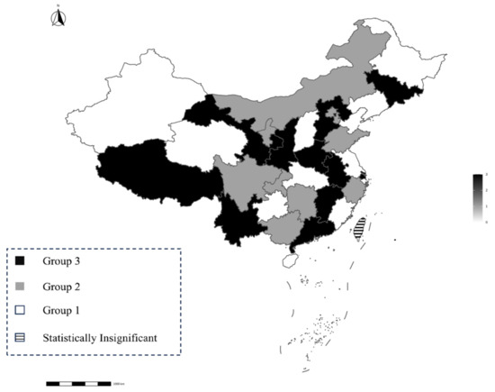 In typical research on regional disparities, subjects are usually categorized into different groups for comparative study. In the context of China, the vast majority of studies directly classify subjects according to geographical variation. This approach is driven by the focus on the disparities between the eastern and western parts of China, where the substantial economic difference is axiomatic from a macroeconomic perspective [23,28,34]. Some research divides Chinese provinces and cities into eastern, central, and western regions, while others compare coastal regions with inland areas in China [29,35].
