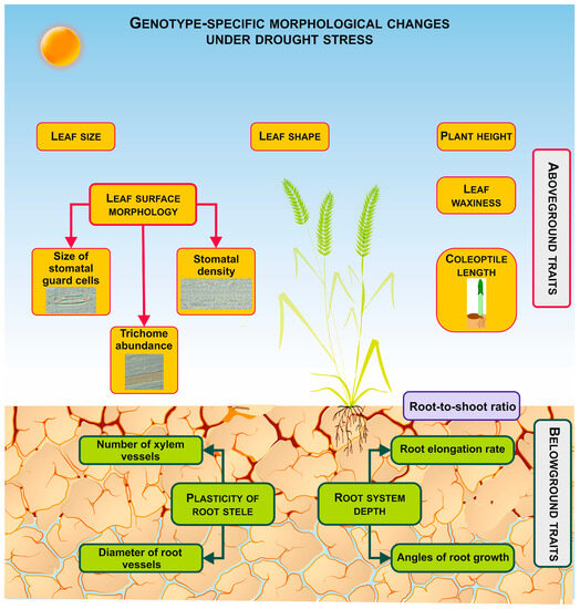 Under drought stress, wheat plants notably change their aboveground traits (Figure 2), encompassing plant height, coleoptile length, leaf size, shape and perimeter, leaf surface morphology and waxiness, and various anatomical adjustments [80,81,82,83]. These variations are contingent upon the drought susceptibility of the genotypes, the duration and severity of drought events, as well as the growth stage of the plants [18,73,84,85].