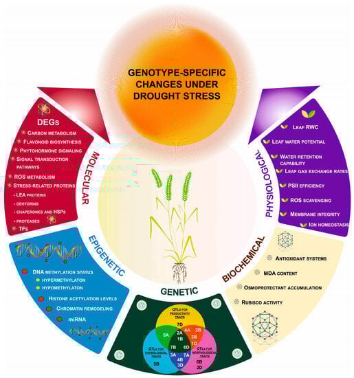 Genotype-dependent physiological, biochemical, molecular, genetic and epigenetic changes in wheat plants under drought stress. Abbreviations: DEGs, differentially expressed genes; LEA proteins, late embryogenesis abundant proteins; MDA, malondialdehyde; miRNAs, microRNAs; PSII, Photosystem II; QTLs, quantitative trait loci; ROS, reactive oxygen species; Rubisco, Ribulose-1,5-bisphosphate carboxylase/oxygenase; RWC, relative water content; TFs, transcription factors. The uppercase letters in the field for genetic changes represent the three wheat genomes (A, B and D), and the Arabic numerals (1–7) correspond to chromosome numbers.