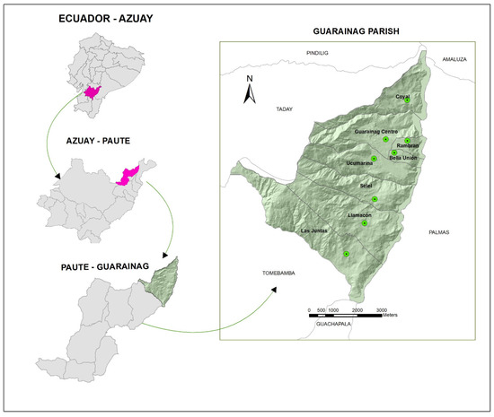 The research was carried out in the Guarainag parish, belonging to the province of Azuay of the Paute canton, which borders the cantons: Azogues (Cañar province), Sevilla de Oro, Guachapala, and the Tomebamba parish (Azuay province). The parish is made up of 8 communities: Las Juntas, Llamacón, Selel, Ucumarina, Bella Unión, Rambran, Coyal, and Guarainag Center, as shown in Figure 1.