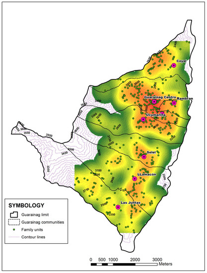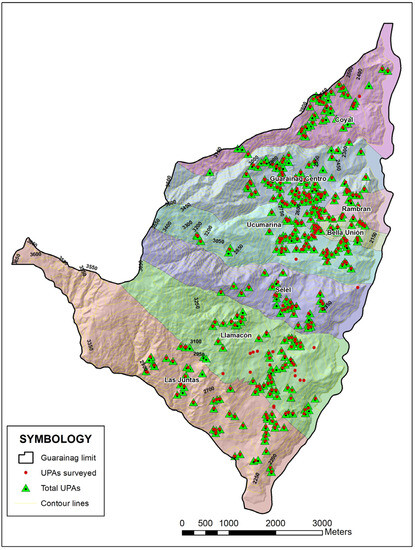 Likewise, the characteristics of the Agricultural Productive Units—UPAs dedicated to family farming, their concentration, area, diversity of products, animal husbandry, bioclimatic floors, irrigation systems, and property ownership were analyzed. Regarding the concentration of family UPAs, these are adjacent to the populated centers of the parish communities, as we can see in Figure 4.