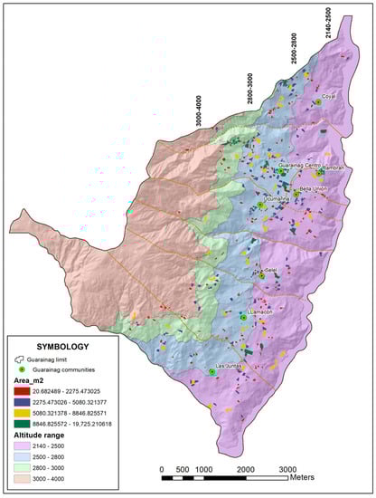 The average area of the agricultural area dedicated to family farming is 2893 square meters, where there is a diversity of products grouped into six species: vegetables, legumes, cereals, fruits, dairy products, and tubers. Regarding the raising of animals, there are four types: chickens, guinea pigs, pigs, and cattle. Livestock and crop production are located in four bioclimatic zones. Likewise, 86.33% of the family farms dedicated to family agriculture are located in two bioclimatic floors, ranging from 2140 to 2499 and 2500 to 2799 m above sea level, as shown in Figure 5.