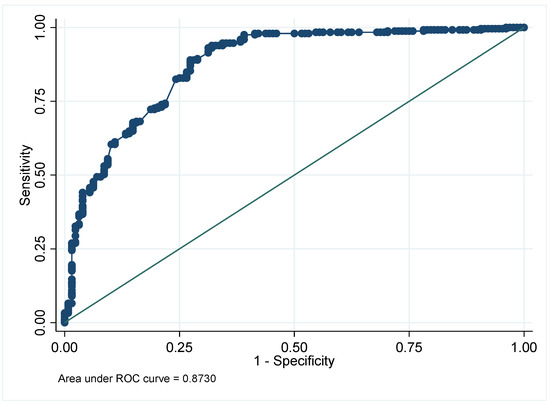 The ROC curve is a graphical representation of the sensitivity and specificity of the logistic regression model. The area at the bottom of the ROC curve is an overall measure of the accuracy of a diagnostic test. The area under the curve must be greater than 0.5 for the model to discriminate adequately. In the research carried out, the curve has an ROC of 0.87 which is a good discrimination since it is close to 1; see Figure 6.