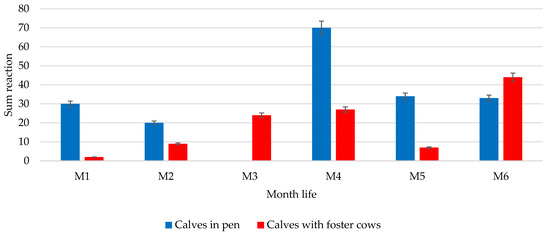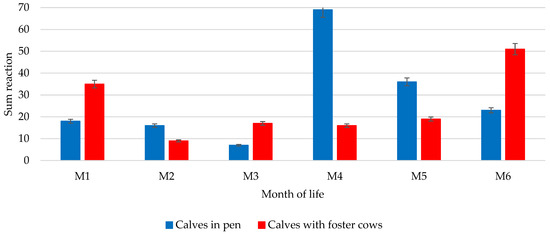 Figure 2 shows the results for the sum of sucking or licking other calves during a one-hour period. The calves in the pen group sucked or licked a total of 187 times, while the calves with the foster cows sucked or licked 113 times, which was 74 times fewer than the control group. The calves in the pen group sucked or licked other calves most frequently during the fourth month of the experiment (70 times) and least frequently during the second month of the experiment (20 times). In the third month of the experiment, no such behavior was observed in the control group. In the case of the experimental group, the calves sucked or licked another individual most frequently in the sixth month of the experiment (44 times) and least frequently in the first month of the experiment (2 times).