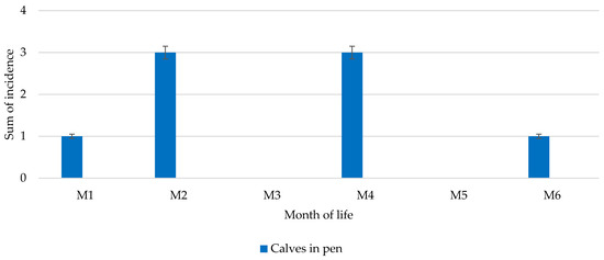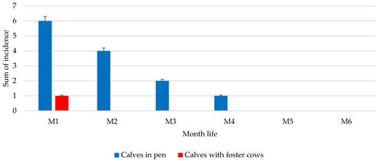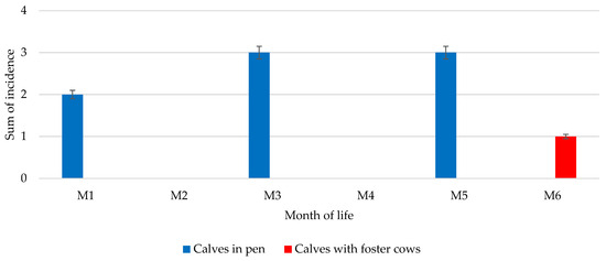 Figure 4 shows the incidence of coughing in the experimental calves. According to the collected information, coughing occurred in both the control and experimental groups. In the calves in pen group, it occurred in the first month of the experiment in two calves, in the third month in three calves, and in the fifth month also in three calves. Coughing in the calves with foster cows group did not occur until the sixth month of the experiment and only affected one individual.