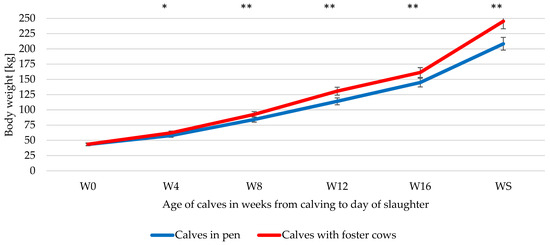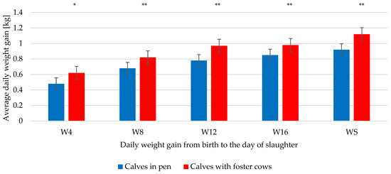 In Figure 7, the daily gains were determined using the changes in body weight between individual weight measurements, with the first weight growth being determined in week four of the experiment. From the very beginning of the experiment there was an evident difference between the daily gains of the calves from each group, with the calves with foster cows group’s weights being higher. In week 4, the daily difference was −0.14 kg (p ≤ 0.05), in week 8 the daily difference was the same −0.14 kg (p ≤ 0.01), in week 12 it was −0.19 kg (p ≤ 0.01), in week 16 it was −0.13 kg (p ≤ 0.01), while on the day of slaughter the daily difference was −0.20 kg (p ≤ 0.01). The results confirm the faster growth rate of calves kept with sucklers and the possibility of obtaining higher animal weights on the day of slaughter.