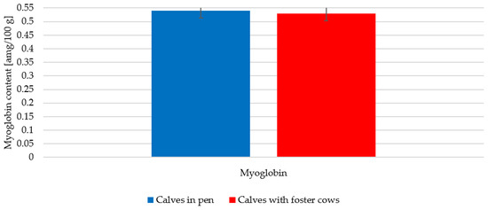 The myoglobin content in the collected tissues from both groups was at a similar level: in the calves in pen group, 0.54 mg, while in the calves with foster cows group it was 0.53 mg, a difference of only 0.01 mg (p ≤ 0.725).