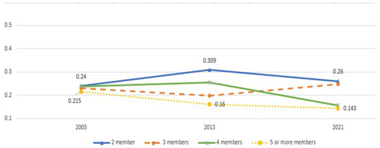 In terms of the inequality by number of household members, in all years, farm households with two members had the highest inequality (Figure 2). The income inequality of the two-person group increased and decreased to 0.240 in 2003, 0.309 in 2013, and 0.260 in 2021, showing higher inequality than other groups. The trend of farm household income inequality by household size is different, and the group that continuously decreased is farm households with five or more people. The income inequality of the two-person and four-person groups increased and decreased, while the income inequality index of the three-person group decreased and then increased. The income inequality of farm households with five or more members is on the decline, with 0.215 in 2003, 0.160 in 2013, and 0.143 in 2021.