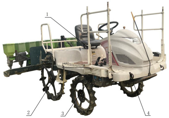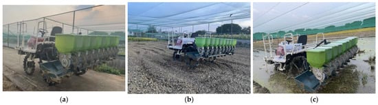 In this experiment, the VPG6G power chassis from the Japanese company Yanmar (Osaka, Japan) was used for rice transplanting, alongside a 2BDXZ-10CP (20) direct seeder for rice holes developed by South China Agricultural University (Guangzhou, China). The associated parameters were obtained through measurements, experiments, and calculations [16,17,18,19,20,21,22], as indicated in Table 1.