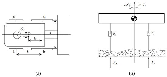 Mizutaki chassis vibration test under different road conditions: (a) center of gravity analysis; (b) power chassis rigid tire–field soil system model. O is the center of mass; a, b, c, and d are left front, left rear, right front, and right rear wheels; Ox is the lateral distance from the center of mass of the fuselage; lbr is the horizontal distance from the center of mass of the body to the axis of the rear wheels; l is the wheelbase of the rear wheels; L is the wheelbase between the front and rear wheels; m is the mass of the power chassis after mounting the live machine; cs is the soil damping coefficient; jb is the inertia of the fuselage pitching;