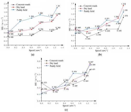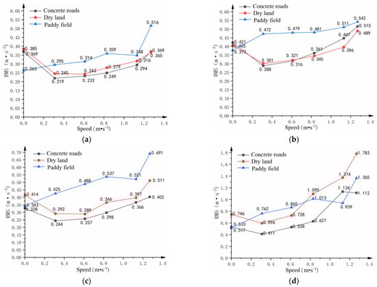 The vibration test results for the chassis powered for paddy operations and equipped with a rice precision hole seeder, operating at varied speeds across paddy fields, dry land, and concrete roads, are illustrated in Figure 4 and Figure 5, respectively.
