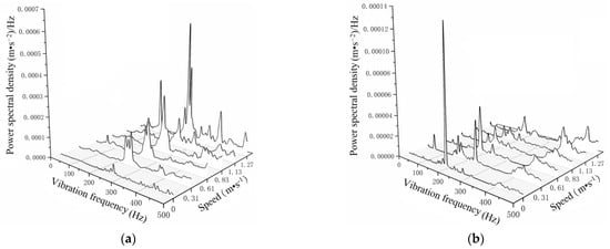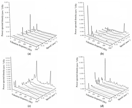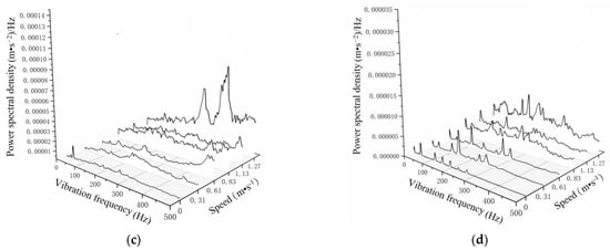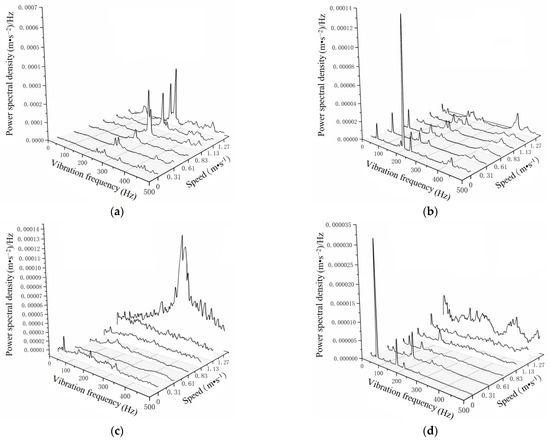 Three-dimensional spectrograms depicting the paddy chassis components under diverse farmland road conditions are illustrated in Figure 6, Figure 7 and Figure 8. These figures highlight the dominance of the power spectral distribution density stemming from the engine’s mixture combustion excitation frequency. The second most pronounced density arises from the excitation frequency due to road conditions. Notably, the vibrational data distribution for concrete paved roads, dry lands, and paddy fields differ considerably in terms of frequency and peak distribution at various speeds. For instance, the seat exhibits a notably higher peak distribution at speeds of 0 m·s−1 (idle) and 1.27 m·s−1 compared to other speed scenarios. Power spectral density peaks at the front axle and seat positions exhibit marked variations across different operational conditions. Conversely, the frequency distribution at the rear axle position diverges distinctly in the paddy field condition compared to concrete paved roads and dry lands. An analysis of the primary vibrational frequency distribution at different speeds indicates that the peak value of the acceleration power spectrum tends to augment with increasing driving speed. Additionally, the principal factors influencing frequency distribution appear to be the engine speed of the paddy power chassis and the road-induced excitation on the front axle.