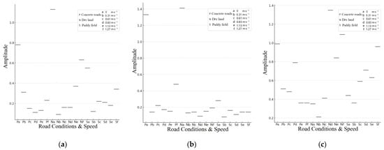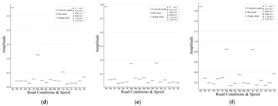 The characteristics of the specific distribution of peaks at each measurement point of the Suita Power chassis under different road conditions and vehicle speeds are shown in Figure 9. Under the three road conditions, the peak distribution of the engine is relatively narrow, with the peaks mainly concentrated near 0.35 m·s−2 and the median of the peaks is close to 0.35 m·s−2; the distribution of the peaks of the seat longitudinal and seat vertical is relatively concentrated, with the median close to 0.2 m·s−2, while the distribution of the seat transverse is relatively wide, with the median close to 0.2 m·s−2. 0.2 m·s−2, while the distribution of the seat transverse peaks is relatively broad, with a median slightly higher than 0.2 m·s−2. Under the concrete paved road conditions, the distribution of the front and rear axle peaks shows several peaks, with the median of the peaks all slightly higher than 0.2 m·s−2. Under dry road conditions, the wave distributions of the front and rear axles show two large peaks. This means that there are two different levels of peaks in this operating environment, with the median of the peaks slightly above 0.2 m·s−2. In the paddy field road condition, the wave distributions of both the front and rear axles show a wider range with several peaks, with the median of the wave peaks on the front axle slightly below 0.2 m·s−2 and the median of the wave peaks on the rear axle slightly above 0.2 m·s−2.