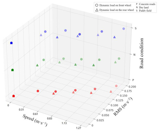 Figure 10 depicts the dynamic load coefficient distribution for the front and rear wheels of the Mizuta power chassis under various road conditions. Analysis of this figure indicates that, within the speed range of 0.31 m·s−1 to 0.83 m·s−1 for the paddy-powered chassis, the growth rate for the front wheels surpasses that of the rear wheels. However, when the speed extends from 1.13 m·s−1 to 1.27 m·s−1, the rear wheels’ growth rate either parallels or exceeds that of the front wheels. Under paddy field road conditions, the front wheels’ dynamic load factor consistently rises as the chassis speed varies from 0.31 m·s−1 to 1.27 m·s−1, with a noticeable deceleration in this ascent between 0.61 m·s−1 and 0.83 m·s−1. Meanwhile, the rear wheels’ dynamic load factor amplifies from 0.31 m·s−1 to 0.61 m·s−1, experiences a minor decline between 0.61 m·s−1 and 0.83 m·s−1, and then resumes its increment. These observations underscore the differential impact of road conditions on the dynamic load coefficients of paddy-powered chassis tires. Specifically, roads in dry land or paddy fields may intensify the vehicle’s shock and vibration, thereby elevating the dynamic load factor. In contrast, smoother concrete paved roads tend to mitigate this factor. On concrete roads, both wheel sets exhibit an ascending dynamic load factor trend with speed, with the front wheels consistently registering higher values than the rear. Under dry road conditions, the dynamic load factors for both wheel sets ascend with speed, albeit at disparate rates.
