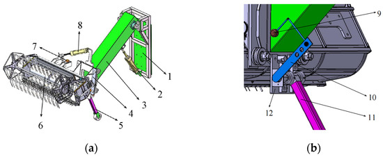 Adaptive profiling header: (1) header support frame, (2) elevation oil cylinder, (3) conveyor groove, (4) rotating disc, (5) profiling mechanism, (6) header, (7) inclination sensor, (8) leveling oil cylinder, (9) the angle sensor, (10) four-link mechanism, (11) the linkage of the profiling wheel, (12) profiling bracket. (a) The structure of the adaptive profiling header. (b) Structure of the profiling mechanism.
