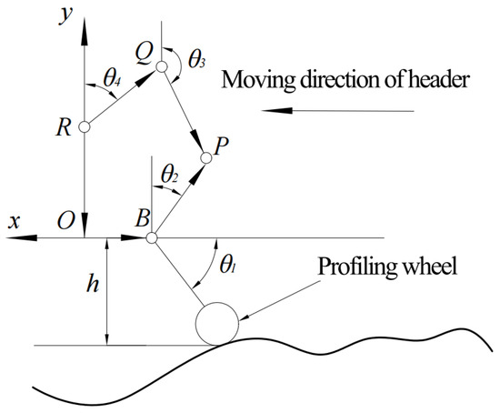 Relative motion relationship of each member of the profiling mechanism. Note: in this article, BP is 230 mm, PB is 158 mm, and QR is 98 mm.