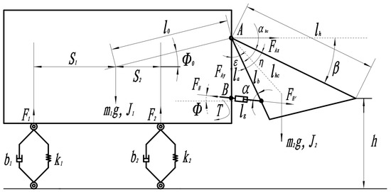 Schematic representation of the header model. Note: S1 represents the horizontal distance between the rear wheel of the soil groove test bench and the center of gravity of the vehicle body; S2 denotes the horizontal distance between the front wheel of the soil groove test bench and the center of gravity of the vehicle body; l0 denotes the distance between the hinge point of the conveying groove and the center of gravity of the vehicle body; T represents the moment between header and body at the connection of elevation cylinder, N·m; F1 and F2 are the equivalent elastic and damping forces of the rear wheel and the front wheel, N; FAx and FAy represent the horizontal force and vertical force at the hinge joint of the conveyor, N; J1 and J2 are the rotational inertia of the rotating body and header, kg·m2; h is header height, mm; k1, k2, b1, and b2 are the elastic coefficient and damping coefficient of the front and rear wheels, respectively; Z1 and Z2 are the horizontal height of the rear wheel and front wheel, respectively, m; θ is the inclination angle of the vehicle body, (°); Φ0 is the angle between the connecting line, linking the hinge joint of the conveying trough and the gravity center of the vehicle body, and the straight line parallel to the vehicle body, (°); Φ is the angle between the hydraulic cylinder and the horizontal plane, (°); αhc is the angle between the connecting line between point a and the header center of gravity and the upper plane of the header, (°); lhc is the distance from point A to the gravity center of header, mm; α is the angle between the elevation cylinder and the conveyor, (°); β is the angle between the header upper plane and the horizontal plane, (°); la and lb are the distance from point a to the two hinge points of elevation cylinder, mm; lg denotes the length of elevation cylinder, mm; FH and FH’ represent the forces exerted by the elevation cylinder on the vehicle body and header, N; lh is the distance between the header upper plane and point A, mm; ε is the angle between two hinge points of elevation cylinder, (°); η is the angle between the header upper plane and the conveying trough, (°).