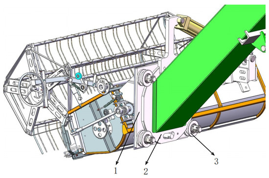 Investigators at home and abroad have researched the automatic adjustment of the cutting height of a combine harvester’s cutting profile system. Tulpule et al. designed a combine harvester header height control system based on the integrated robust optimal design (IROD) method [13], whereas Kassen et al. employed the robust feedback linearization (RFL) approach to enhance the robustness of the header height control system while reducing the control system power consumption [14]. Ni et al. designed an adaptive control system for the height of the soybean combine harvester based on a soil machine system, with an accuracy of 92% for the header contour control [15]. The above research works are mainly focused on the control strategy and control algorithm research of the header profiling system, rather than structural design. Additionally, due to the complexity of the planting environment for ratooning rice, the above research has poor adaptability to the harvesting of ratooning rice.