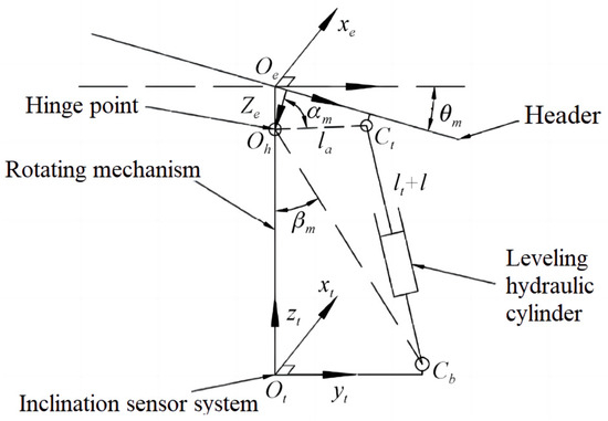 In the xtotytzt coordinate system, the positive direction of xt corresponds to the heading direction of the header, and the inclination sensing plane is parallel to the horizontal plane. When the header tilts to the right, the measured inclination is positive, while a leftward tilt yields a negative inclination. In the xeoeyeze coordinate system, the positive direction of xe aligns with the forward speed direction of the header. The mechanism can be simplified as the connection point between the header and the rotating hinge point, as well as the oil cylinder. Assuming a positive clockwise rotation angle of the header relative to the soil tank test bench, the elongation of the leveling oil cylinder rod l and the tilt angle of the header relative to the soil tank test bench are adjusted as follows: