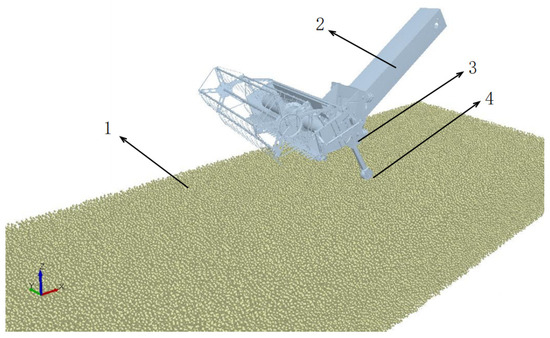 A discrete element model: (1) soil particle bed, (2) header, (3) marker point Ⅰ, (4) marker point Ⅱ and General Force.