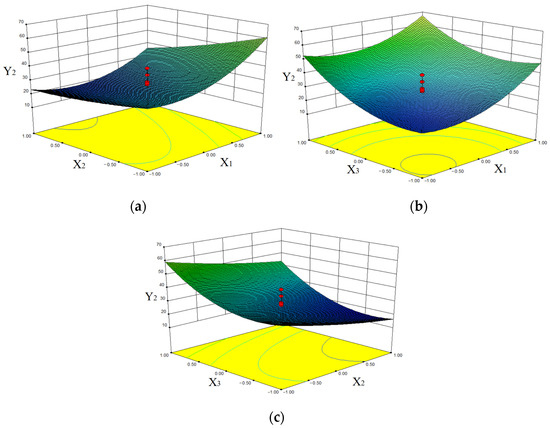 In the Y1 regression model, the primary terms X1, X2, and X3 and the secondary terms X12, X22, and X32 have a significant impact (p < 0.05). In the Y2 regression model, the primary terms X1, X2, and X3 and the secondary terms X12 and X32 have a significant impact (p < 0.05). In the Y3 regression model, the effects of primary terms X1, X2, and X3 and secondary term X12 were extremely significant (p < 0.01). To ensure that the model is significant and the mismatched items are not significant, the regression model after removing insignificant factors is expressed as follows: