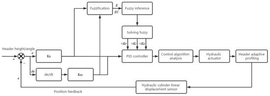 After determining the structural parameters of the adaptive profiling header, the control system was designed. Fuzzy rules were used to dynamically adjust the PID controller parameters, which can achieve the adaptive tuning of PID parameters and enhance the dynamic response ability of the system [25,26,27]. The fuzzy PID controller of the header adaptive profiling system mainly consists of an incremental PID controller and a fuzzy controller [28,29,30]. The fuzzy controller, based on fuzzy rules, is the key component of the whole controller. The fuzzy controller completes the parameter adaptive tuning through different processing, including fuzzification, fuzzy reasoning, and defuzzification. The fuzzy PID block diagram of the header adaptive profiling system is illustrated in Figure 8. The hydraulic cylinder linear displacement sensor takes the actual hydraulic rod displacement c(k) value as the actual value of the controller. It externally inputs the given values of the header height and angle r(k) to obtain the error e(k)(e(k) = r(k)−c(k)) and the change rate of the error after differentiation ∆e(k)(∆e(k) = de(k)/dt).