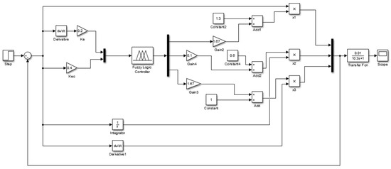 Based on the developed system model, a fuzzy PID control simulation model is established using the Simulink simulation module in MATLAB. The step signal is employed as the system input, and the transfer functions of each link of the adaptive profiling control system are substituted into the Simulink simulation platform to construct the system simulation model, as illustrated in Figure 9.
