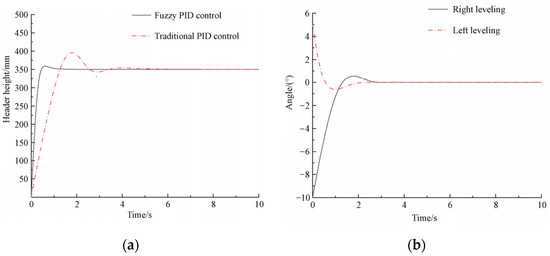 Compared with traditional PID control, the simulation time of the system was set to 10 s. When the position of the header was adjusted from 0 to 350 mm, the simulation curve of the header response characteristics is as shown in Figure 10a. As shown in the figure, traditional PID control reaches a steady state at 4.9 s, with a maximum overshoot of 46 mm; fuzzy PID control reaches a steady state at 0.9 s. Compared with traditional PID control, the system’s rise time is reduced by 78.9%, the time required for the system to reach a steady state is reduced by 81.6%, and the system overshoot is 8.2 mm. The system stability is stronger. With any set initial angle and a simulation time of 10 s, the simulation curve of the header leveling response characteristics is as shown in Figure 10b. It can be seen that using fuzzy PID control, the system overshoot is less than 1°, and it can reach a steady state within 2.8 s. The average response speed of the header leveling to the left is about 2.38°/s, and the average response speed of the header leveling to the right is about 3.22°/s. The adjustment speed can meet the usage requirements.