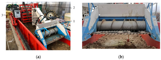 Header test: (a) side view, (b) front view. (1) Header; (2) soil tank test trolley; (3) control panel.