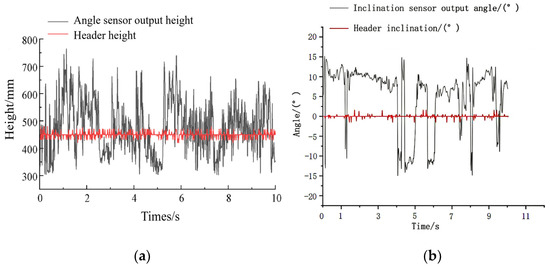 Taking the header height data measured by the angle sensor as a reference, the angle sensor output data could accurately represent the height between the header and the ground in real time. During the movement, the header height was always maintained at around 450 mm, with an average error of 6.75 mm and a maximum error of 11.63 mm. The header height control effect was good; the output angle measured by the inclination sensor was the inclination angle of the undulating road surface. The header remained horizontal throughout the movement, with an average error of 0.64° and a maximum error of 2.35°. The control effect was ideal and had a high control accuracy, indicating that the design of the profiling mechanism is reasonable and can accurately reflect the undulating conditions of the ground. The real-time data collection results are shown in Figure 12.