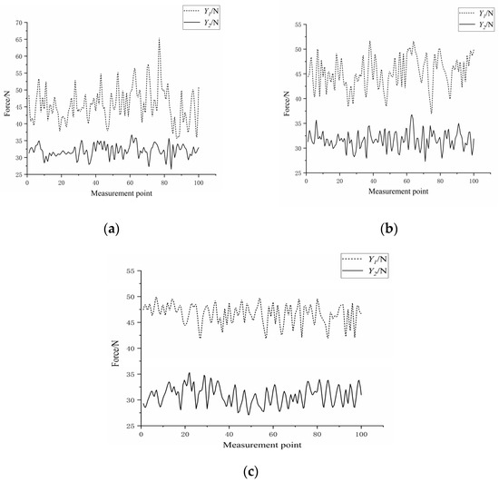 The values of Y1 and Y2 during the movement of the header were measured using a digital transmitter and pressure sensor, as shown in Figure 13. The average values of Y1 in the three experiments were 46.61 N, 47.26 N, and 48.63 N. It can be observed that Y1 was always greater than 0, indicating that the profiling wheel is in normal working condition during movement. The average values of Y2 were 31.98 N, 31.63 N, and 30.86 N, with similar values to the simulation results of 30.3 N, indicating reliable simulation results and a sensitive profiling wheel to the perception of ground undulation changes. The average values of soil subsidence depth Y3 were 3.4 mm, 5.6 mm, and 8.3 mm, indicating that the soil subsidence depth was relatively small during operation. The profiling wheel can accurately perceive changes in the soil surface height.