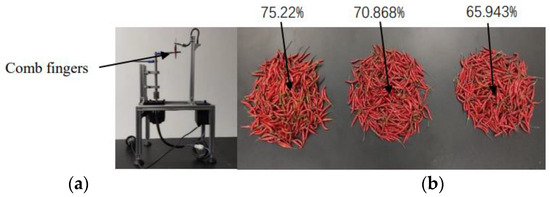- Cheng, Y.; Hu, S.; Yuan, Y. Research of comb-type picking device for chilli peppers. In Proceedings of the 2012 International Academic Annual Conference of China Agricultural Machinery Society, Hangzhou, China, 20 October 2012; pp. 942–948. [Google Scholar]